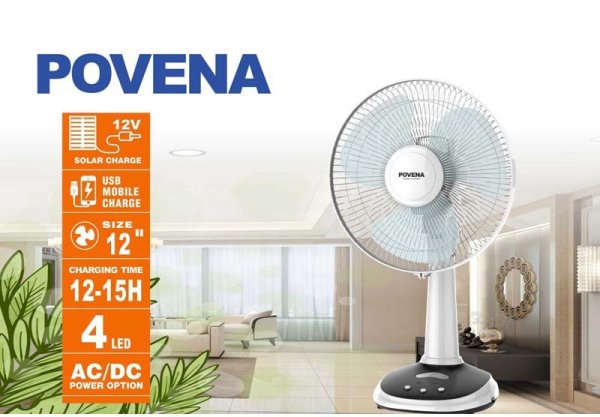 Quạt tích điện POVENA sở hữu kiểu dáng nhỏ gọn, thiết kế tiện lợi và tiết kiệm không gian của căn phòng. Sản phẩm sở hữu 2 cổng sạc tiện lợi cho người dùng, phù hợp để cắm vào điện thoại, laptop. Với đường kính lớn đến 8 inch và công suất hoạt động 24W, thiết bị mang đến cho căn phòng luồng gió thoáng mát và tản đều mọi ngóc ngách.