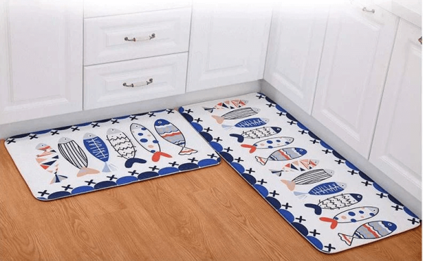 Các loại thảm dậm chân, lót chân, miếng lót sàn bếp có nhiều họa tiết và kích thước không quá lớn sẽ giúp không gian bếp rộng rãi hơn. Nên chọn các loại họa tiết tươi vui hoặc con vật để phòng bếp trở nên đáng yêu hơn.