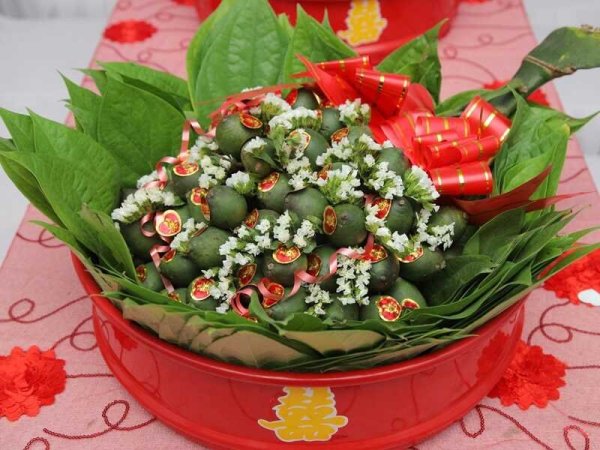 Mâm trầu cau là sính lễ không thể thiếu trong văn hóa cưới hỏi của người Việt (Nguồn: charmingflowers.com.vn)Trầu cau mang ý nghĩa gắn bó thủy chung, được khắc họa bởi hình ảnh dây trầu quấn quanh thân cây cao. Màu xanh của lá trầu hòa với múi cau và một ít vôi trắng tạo nên một màu đỏ thắm. Gửi gắm lời cầu chúc về sự sắc son và mặn nồng đến cặp vợ chồng mới cưới.