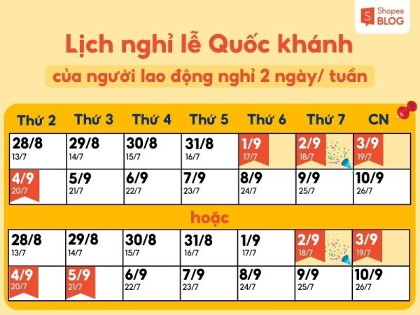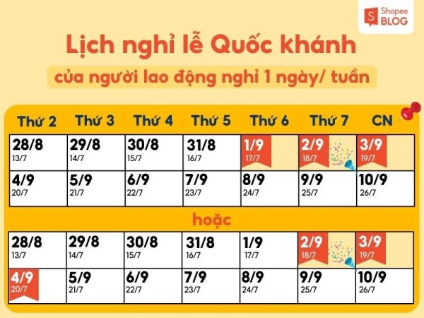 - Những người lao động còn lại: Vì ngày 2/9 rơi vào thứ Bảy nên doanh nghiệp có thể cân nhắc chọn nghỉ ngày thứ Sáu (1/9) hoặc Chủ nhật (3/9) bên cạnh ngày nghỉ 2/9. Nếu người lao động nghỉ Chủ nhật mỗi tuần thì sẽ có 3 ngày nghỉ ( 1/9 – 3/9 hoặc 2/9 – 4/9). Nếu người lao động nghỉ thứ Bảy và Chủ nhật mỗi tuần thì sẽ có 4 ngày nghỉ ( 1/9 – 4/9 hoặc 2/9 – 5/9).