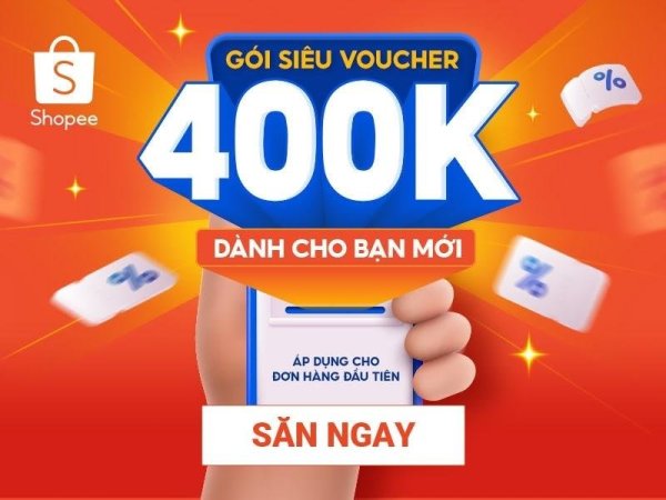Áp dụng cho đơn hàng đầu tiên tại Shopee, bạn sẽ được nhận ưu đãi gói siêu voucher 400K. Nhớ bấm lưu tất cả các mã giảm giá Shopee tặng bạn để trải nghiệm ưu đãi đơn đầu tiên nhé
