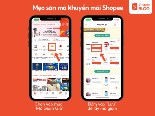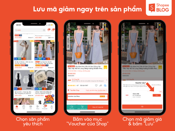 Nhằm kích thích người dùng mua hàng, các shop thường tạo mã giảm giá ngay trong sản phẩm. Do đó, người mua có thể lưu mã giảm giá khi chọn mua sản phẩm mà mình yêu thích. Để lưu mã giảm giá ngay trên sản phẩm, người mua thực hiện như sau: Chọn sản phẩm yêu thích > Voucher của Shop > chọn mã giảm giá > Lưu.