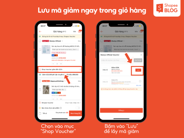 Khi thanh toán đơn hàng, người mua có thể lấy mã giảm giá tại giỏ hàng để có thể mua hàng với giá tốt hơn. Cách lấy mã giảm ngay trong giỏ hàng như sau: Vào giỏ hàng > Shop Voucher > Lưu.