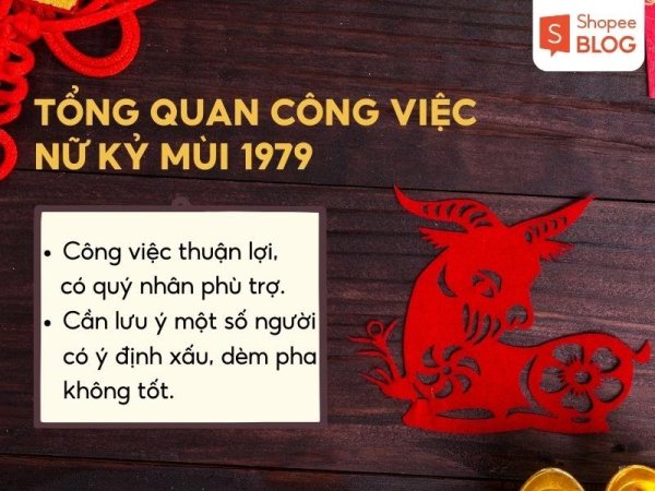 Nữ Kỷ Mùi 1979 thường mang đến những nguồn tích cực cho đồng nghiệp lẫn cấp trên nên con đường sự nghiệp khá ổn định, nếu chăm chỉ nỗ lực sẽ gặt hái được một vài thành công nhất định. Tuy nhiên, vẫn không tránh khỏi một số kẻ dèm pha, đố kị nên nữ Kỷ Mùi cũng nên lưu ý một chút.