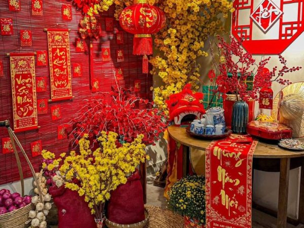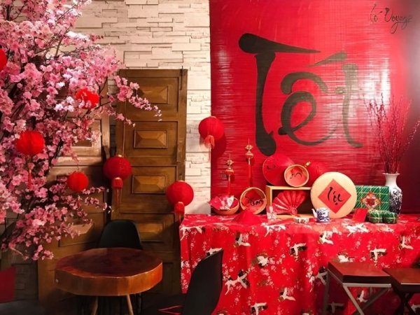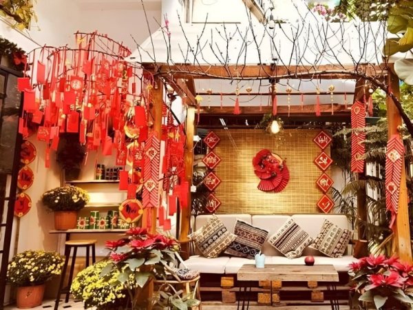 Phông nền đỏ là gam màu đặc trưng cho ngày tết (Nguồn: homedy.com) Gam màu đỏ rất được ưa chuộng trong decor quán cafe ngày tết (Nguồn: ELLE) Mua NgayTrang trí tết quán cafe với tre hoặc nứa