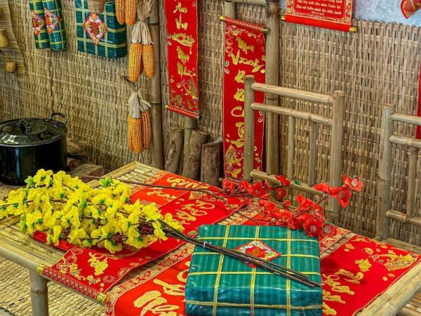 Dựng lên những tiểu cảnh tết bằng tre hoặc nứa là một cách trang trí tết quán cafe vô cùng hút khách. Cách trang trí tết cho quán cafe này sẽ tái hiện khung cảnh ngày tết cổ truyền của người Việt Nam, lưu giữ những kỷ niệm nhẹ nhàng và vô cùng bình yên. Bạn có thể dựng mô hình không gian bếp với nồi than, manh chiếu, bắp khô, tủ chén hay những bộ bàn ghế và sạp nằm bằng tre, đều là những những món đồ vô cùng mộc mạc, gần gũi và thân quen.