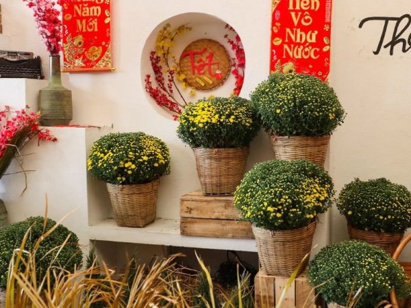 Hoa tươi là một đặc trưng cho mùa xuân tươi mới và tràn đầy sức sống, mang đến may mắn, hạnh phúc và an yên. Vì vậy những chậu hoa tươi rực rỡ là món đồ không thể thiếu khi trang trí tết quán cafe. Chỉ đơn giản với những bình hoa tươi sắc màu đặt ở cổng, trong quán hay ngoài sân bạn đã có thể tạo điểm nhấn cho quán giúp thu hút được nhiều khách hàng đến quán hơn. Những loại hoa đặc trưng cho mùa tết vô cùng nổi bật mà bạn có thể sử dụng như hoa cúc vàng, hoa hồng, hoa mai và hoa đào.