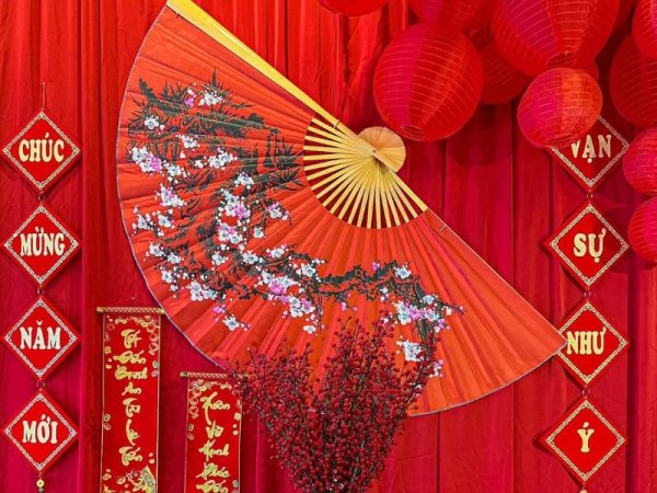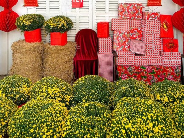 Phông nền đỏ là một màu nền chủ đạo được sử dụng trong hầu hết cách trang trí tết cho quán cafe. Bạn có thể sử dụng những tấm vải lụa hay vải nhung để phủ lên bức tường tạo nên một góc nền đỏ nổi bật rực rỡ trong quán cafe và trang trí thêm một vài món đồ đơn giản như bánh chưng, dưa hấu hay cành hoa. Chỉ với những vật dụng đơn giản này bạn đã có được một góc decor mang đậm màu sắc của tết truyền thống và vô cùng thu hút cho không gian quán rồi đấy.