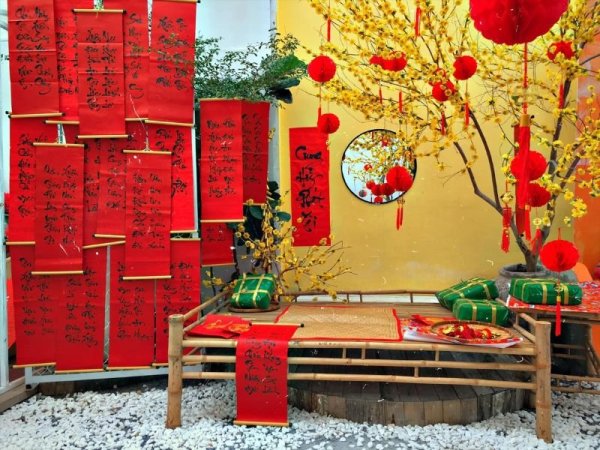 Trang trí tết quán cafe bằng câu đối đỏ mang đến nhiều ý nghĩa (Nguồn: homedy.com) Câu đối đỏ giúp mang lại sự may mắn và tài lộc cho quán cafe (Nguồn: alongwalker.co) Mua NgayTrang trí quán cafe bằng hoa mai giả