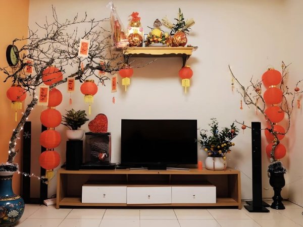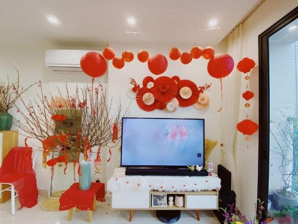 Trang trí tiểu cảnh Tết trong nhà đơn giản nhưng vẫn nổi bật với đèn lồng đỏ (Nguồn: Johanna HA – Pinterest) MUA NGAYĐể decor tiểu cảnh Tết đẹp, hãy sử dụng thêm cây mai, cây đào hoặc cây quất nhé. Đừng quên dùng các phụ kiện như lồng đèn, câu đối, đồng xu, bao lì xì,… để treo lên cây. Ngoài ra, bạn cũng có thể bổ sung các bộ quạt trang trí dántường vào tiểu cảnh để giúp tổng thể thêm nổi bật.