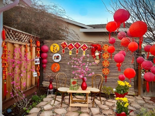 Tiểu cảnh trang trí Tết văn phòng ngoài trời với hoa, đèn lồng và phụ kiện treo đặc sắc (Nguồn: greenscapedecor.com) MUA NGAYMẫu trang trí tiểu cảnh Tết mầm non