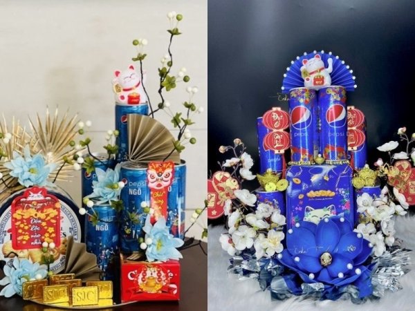 Tháp Pepsi là vật phẩm trang trí có thành phần chính là những lon nước ngọt Pepsi dung tích 330ml. Bạn có thể dùng 5, 7 hoặc 9 lon để xếp thành hình tháp 2, 3 tầng tùy thích. Ngoài lon nước ngọt Pepsi đặc trưng, thì mẫu tháp này còn được nhấn nhá thêm hoa giả, ruy băng, thỏi vàng, quạt giấy hoặc những câu đối mini,… cho thêm phần bắt mắt.