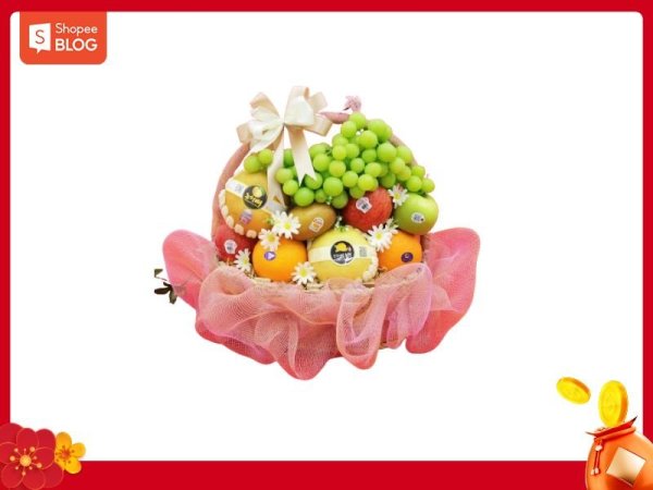 Giỏ trái cây quà Tết cho bố mẹ vợ (Nguồn: Shopee Blog) Mua NgayGiỏ bánh mứt Tết