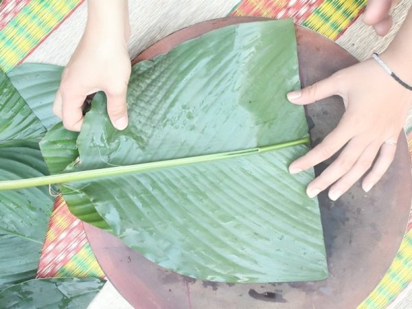 - Bạn đặt 2 chiếc lá dong sao cho vuông góc với nhau và úp mặt phải của lá xuống dưới.