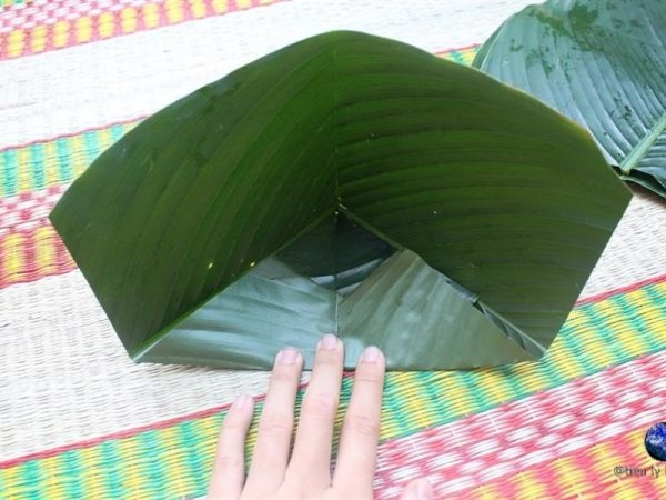 Tiến hành gấp đôi lá lại, để mặt bóng hướng úp vào trong và gấp lá thành hình tam giác rồi dùng tay vuốt nhẹ để tạo nếp. Sau đó, mở rộng lá ra, dùng tay trái cố định đầu lá bên trái, dùng ngón tay phải ấn ngược lại đường gấp tam giác ban đầu vào trong, đồng thời di chuyển tay trái cho lá đứng dậy thành hai mặt phẳng vuông góc. Làm tương tự với ba lá tiếp theo xếp vào trong khuôn bánh.