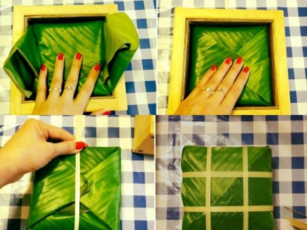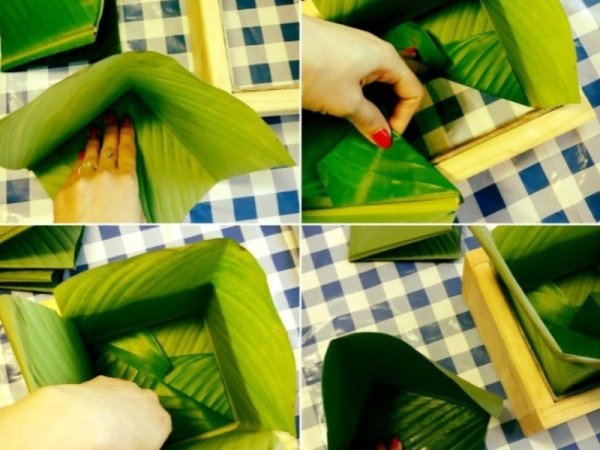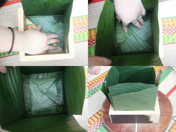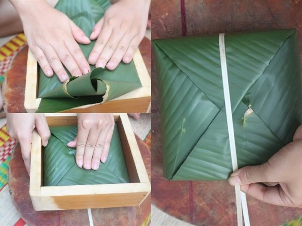Cách gói bánh chưng vuông lá chuối bằng khuôn (Nguồn: digifood.com)Cách gói bánh chưng dài