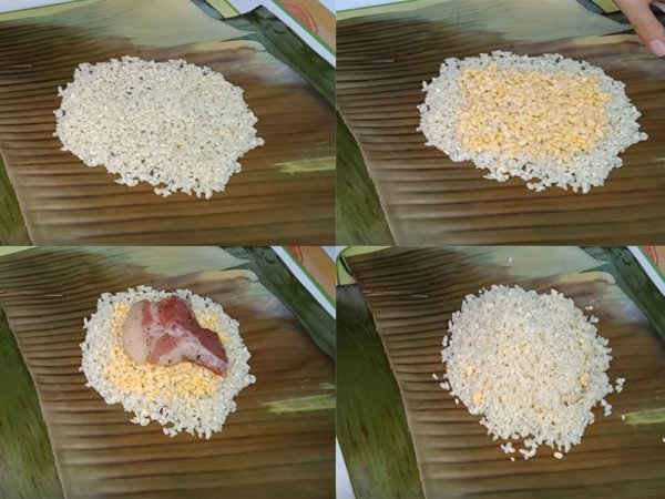 - Cho một bát gạo vào giữa phần lá đã xếp, ½ nắm đậu xanh, 1-2 miếng thịt heo và một bát gạo nếp lên trên phần nhân.