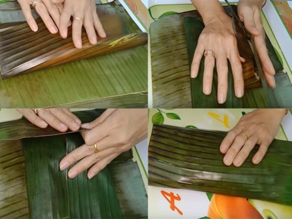 - Lá chuối và lá dong: Rửa sạch cả hai mặt và để ráo nước. Sau đó dùng dao cắt sống lá, lưu ý là cắt sát vào lá nhưng tránh quá sâu sẽ làm tránh lá bạn nhé!