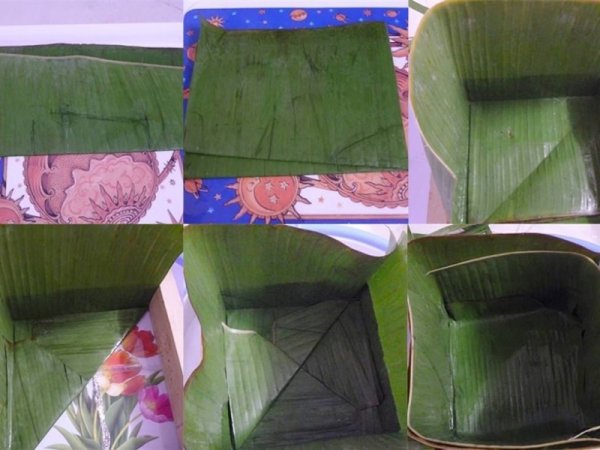Cách gấp lá gói bánh chưng (Nguồn: cooky.vn)Bước 3: Cách xếp lá gói bánh chưng vào khuôn