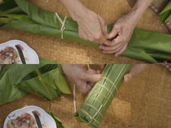 - Bạn gói bánh theo hình sống lá, cố gắng vuốt và nén bánh chặt tay. Sau đó, dùng một dây lạt buộc cố định ở giữa phần bánh.