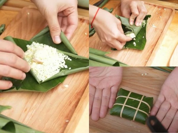 Cách gói bánh chưng ngày Tết thơm ngon và xanh dẻo (Nguồn: eva.vn)Bước 3: Tiến hành gói bánh