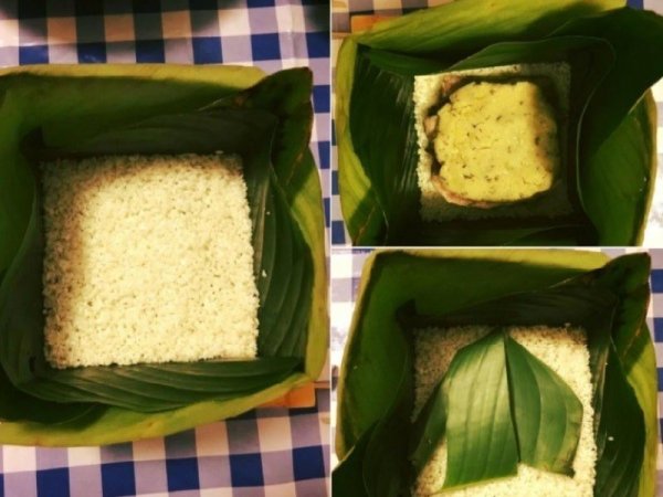 Đầu tiên, bạn đặt lá chuối lên mâm hoặc bất cứ mặt phẳng nào, lấy đủ bốn lá chuối xếp xen kẽ với nhau tạo thành hình chữ thập (dọc – ngang – dọc – ngang). Tiếp đó, bạn lần lượt cho nguyên liệu vào bánh theo tỷ lệ nửa chén gạo nếp, 2 muỗng cà phê đậu xanh, 1 miếng thịt và cuối cùng là một chén gạo phủ đều lên phần nhân ở giữa.