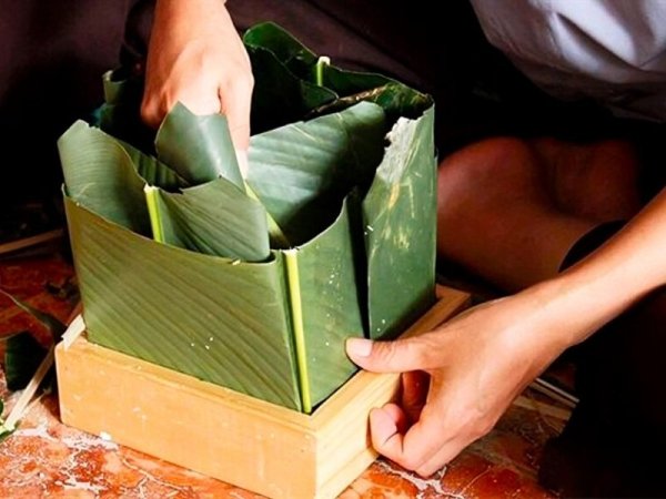 - Bước 1: Đặt 2 lá dong sao cho một nửa của một lá đè lên nửa kia và vuông góc với nhau. Đặt thêm 2 lá dong khác, mặt phải hướng lên trên và vuông góc với 2 lá trước. Úp khuôn nhỏ bên trong vào giữa các lá.