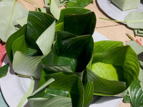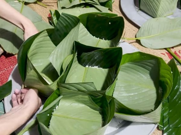 Cách gói bánh chưng bằng tay bước 2 là xếp chồng các lá dong đã gấp theo từng tầng đối xứng (Nguồn: Youtube An Nhiên)Bước 3: Để nguyên liệu vào khuôn bánh chưng làm bằng lá dong