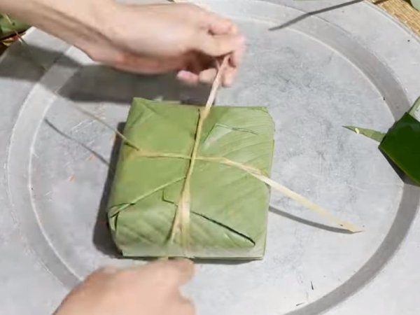 Dùng lạt buộc vuông góc xung quanh bánh để cố định bánh chưng (Nguồn: Youtube An Nhiên)> Xem thêm: Khám phá 15+ các loại bánh ngày Tết không thể thiếu
