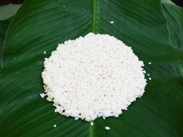 Xếp bốn lớp lá dong thành hình chữ thập (Nguồn: meohay.vn)Bước 2: Đổ một lớp gạo nếp vào giữa phần lá mới xếp. Chú ý đổ gạo ở phần tâm của góc vuông, tránh đổ tràn ra các phần viền lá.