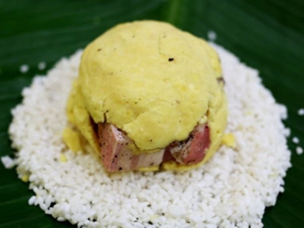 Với phần khuôn hộp vuông đã xếp sẽ tiến hành đổ nhân vào. Trước tiên trải một lớp nếp đầy mặt đáy. Tiếp theo là trải một lớp đậu xanh mỏng hơn lên trên mặt nếp và thêm vài miếng thịt lên. Cuối cùng cho thêm một lớp mỏng đậu xanh và phủ phần nếp còn lại kín lớp nhân.