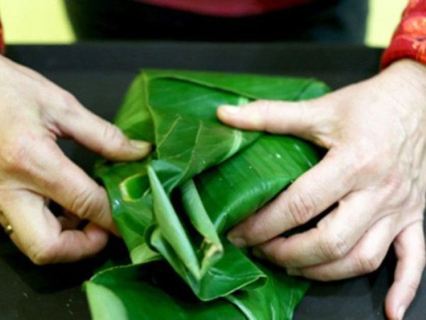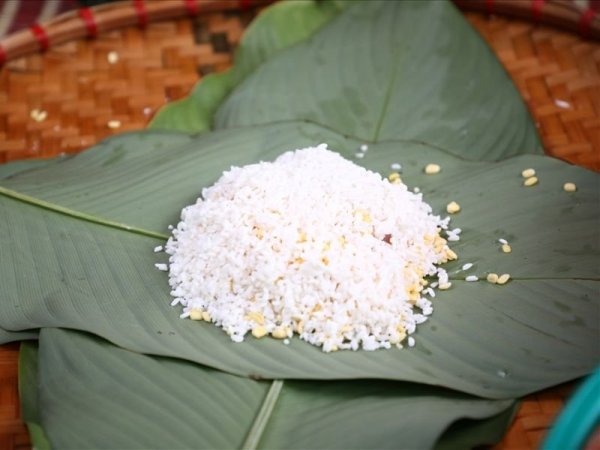 Thêm phần nhân đậu xanh và thịt lên trên gạo nếp (Nguồn: meohay.vn) Phủ kín phần nhân và đậu bằng một lớp gạo nếp phía trên (Nguồn: laodong.vn)Bước 4: Lần lượt gấp các lá dong vào và giấu các mép thừa vào trong hoặc có thể cắt đi. Tiếp theo để cố định hai đầu, dùng các đầu ngón tay bóp phần lá vào trong và ngón cái vẫn giữ cố định phần lá đã gấp trước.