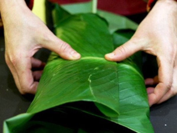 Bạn có thể luồn sẵn một sợi lạt dưới mặt đáy khuôn bánh để giúp cố định. Đặt một lớp lá mỏng bên trên phần bánh để cố định. Vừa thao tác kéo và kéo các cạnh miếng lá song song vào nhau tạo thành chóp nhọn. Sau đó cuốn cố định sợi lạc có sẵn ở giữa theo hướng gập cuối cùng để giữ cho khuôn lá không bị bung ra. Chú ý lồng mối dây xuống phía dưới sợi lạt để có thể giữ chặt dây.