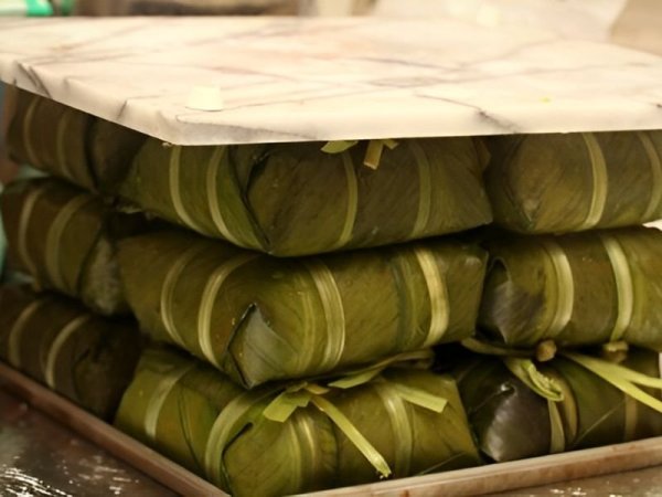 Dùng tấm ván hoặc vật nặng để ép bánh chưng là cách gói bánh chưng bằng tay giúp bánh khô ráo và dẻo hơn (Nguồn: Báo lao động)> Xem thêm: 15+ các loại chả Tết không thể thiếu trong mâm cỗ người Việt