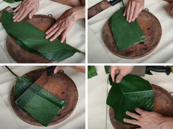 Lá dong gấp vuông thành 4 góc hình hộp (Nguồn: Youtube Phúc Hà HCM)Bước 2: Tạo khuôn bánh chưng kiểu xếp góc vuông