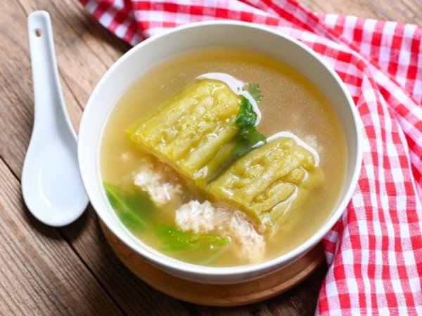 Nhiều người dân miền Trung quan niệm năm mới ăn khổ qua cho “cái khổ nó qua” vậy nên canh khổ qua cũng là một trong số những món ăn đặc trưng trong mâm cơm Tết miền Trung. Khi chế biến, phần thịt nhồi bên trong được băm nhỏ với mộc nhĩ, tiêu, hành,… Khi nấu khổ qua cũng trở nên ngon miệng với vị đắng nhẹ, ngọt tự nhiên, cay cay của tiêu và hương thơm nồng của hành. Canh khổ qua không chỉ là một món ăn có lợi cho sức khỏe mà còn là biểu tượng của sự lạc quan, hy vọng cho một năm mới tốt lành và qua đi mọi khó khăn.