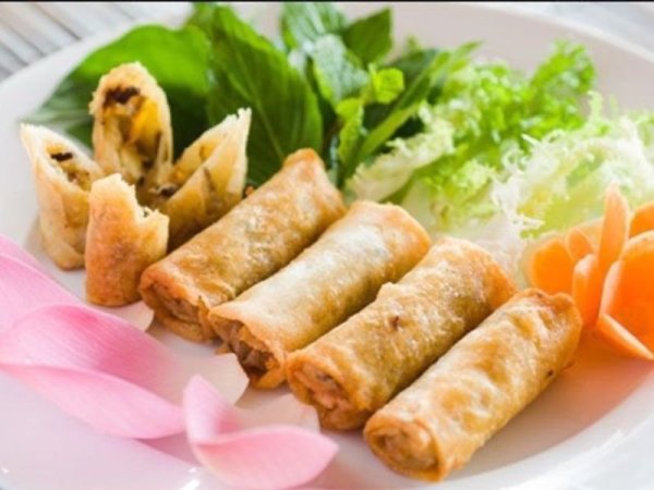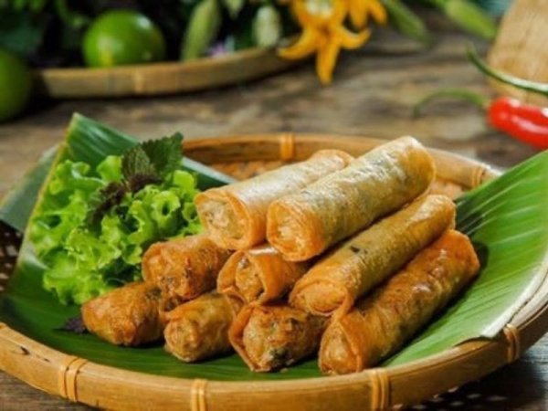 Dùng mẹt tre đựng nem rán là cách trang trí được yêu thích (Nguồn: Vngoods.top) Mua Ngay Tỉa hoa từ rau củ để trang trí giúp dĩa nem rán hấp dẫn hơn (Nguồn: dacsandalat.biz)Giò lụa
