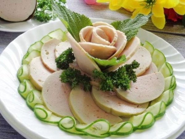 Giò lụa là món ăn được yêu thích trong mâm cỗ ngày Tết mang ý nghĩa cầu chúc cho may mắn và phúc lộc đầy nhà. Để trang trí mâm cỗ tết đẹp với món giò lụa bắt mắt bạn có thể cách thành từng miếng nửa hình tròn rồi xếp đan xen lên đĩa. Nếu khéo tay hơn bạn hãy cắt thật mỏng miếng giò sau đó xếp thành từng cánh hoa hồng đặt ở giữa tạo điểm nhấn sẽ vô cùng bắt mắt và ghi điểm trong mắt mọi người đấy.