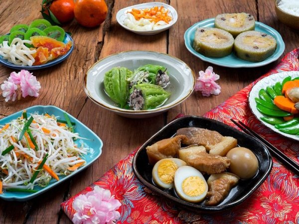 - Thịt kho tàu, dưa cải chua, canh khổ qua nhồi thịt, bò xào hành tây, trái cây, các loại mứt: Các món trong thực đơn này bổ trợ hương vị cho nhau. Vị chua của dưa cải giúp gia giảm độ béo của thịt, vị ngọt của thịt bò trung hòa vị hăng của hành tây và vị đắng của khổ qua. Sau cùng, trái cây bổ sung vitamin cần thiết cho cơ thể.