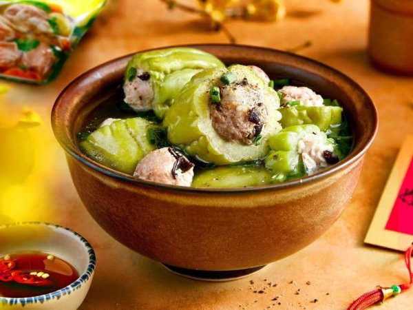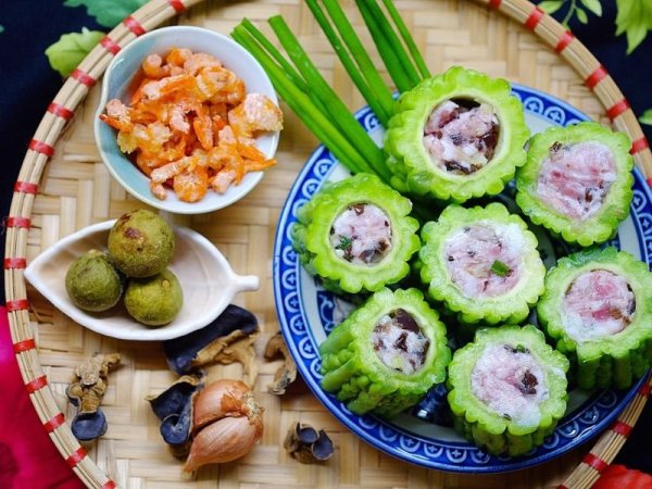 Canh khổ qua nhồi thịt vô cùng thích hợp để dùng trong ngày Tết vì khổ qua có tính thanh nhiệt, giải độc. Ngoài ra, khổ qua còn cung cấp chất xơ, giúp cân bằng chế độ dinh dưỡng có nhiều xáo trộn trong ngày Tết. Nếu bạn cảm thấy do dự vì vị đắng của khổ qua, hãy cạo sạch hạt và lớp xơ trắng bên trong, trụng khổ qua bằng nước ấm, sau đó ngâm vào nước đá. Cách làm này sẽ giúp giảm kha khá vị đắng của khổ qua.