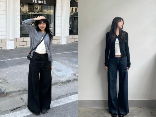 Chỉ cần một chiếc quần jean ống rộng màu xanh cổ điển, kết hợp với áo cardigan len dáng lửng có cúc cài trước, bạn đã có ngay outfit lý tưởng để đi học, đi làm hoặc đi cà phê cuối tuần.