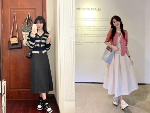 Các nàng có phong cách bánh bèo, công chúa nhất định không thể bỏ qua cách phối này (Nguồn: Tips Hay/pinterest.com, SHEIN/pinterest.com)Bạn có thể hoàn thiện set đồ bằng đôi giày búp bê hoặc boot cổ ngắn, giúp vừa thoải mái lại vừa giữ được nét thanh lịch. Với những ngày bạn muốn nổi bật hơn, hãy chọn chân váy màu nổi như đỏ rượu, tím lavender hay xanh navy để tạo điểm nhấn thú vị cho tổng thể trang phục.