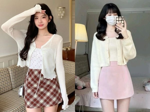 Những cô nàng theo đuổi phong cách nữ tính chắc chắn không thể bỏ qua sự kết hợp giữa áo cardigan ngắn và chân váy ngắn. Kiểu phối đồ này không chỉ dễ thương mà còn cực kỳ tôn dáng. Áo cardigan dáng lửng khi kết hợp với chân váy chữ A hoặc chân váy xếp ly ngắn sẽ giúp kéo dài đôi chân, đồng thời tạo hiệu ứng thon gọn phần thân dưới.
