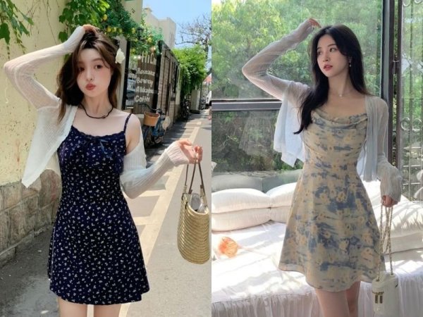 Bạn có thể chọn các mẫu váy hoa dáng xòe chất liệu voan nhẹ, chiffon hoặc cotton, kết hợp cùng áo cardigan len ngắn cài nút hờ hững. Cách mặc cardigan hơi buông nhẹ như khoác hờ qua vai cũng là một kiểu mix được các fashionista Hàn Quốc rất ưa chuộng. Outfit này giúp bạn khéo léo che đi phần bắp tay to một cách tinh tế.