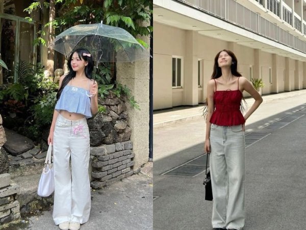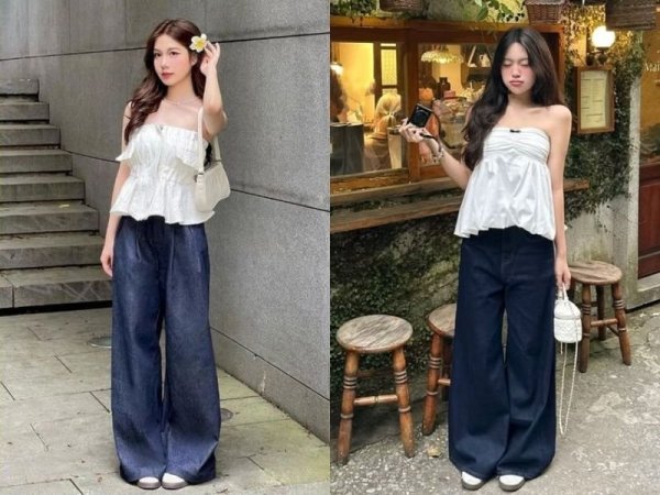 Một trong những combo được yêu thích gần đây chính là sự kết hợp giữa quần jean ống rộng và áo hai dây kiểu. Cách phối này không chỉ giúp bạn khoe được đôi vai trần quyến rũ mà còn tạo hiệu ứng thị giác kéo dài cơ thể, đặc biệt phù hợp với các cô nàng có chiều cao khiêm tốn.