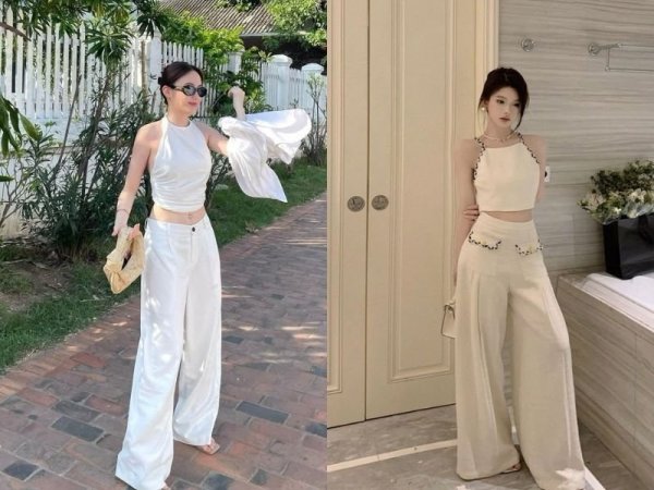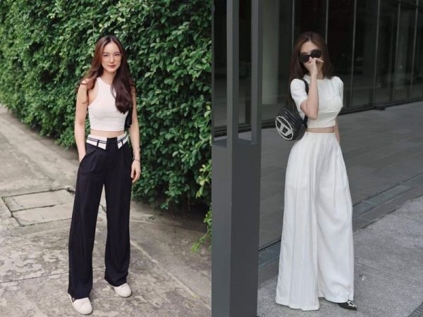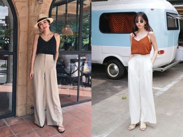 Khi kết hợp thêm giày cao gót hoặc quần ống rộng cạp cao, đôi chân bạn sẽ được “nâng cấp” tức thì, tạo hiệu ứng dáng chuẩn “mình hạc xương mai” (Nguồn: Hana/pinterest.com, Be You/pinterest.com)Quần ống rộng phối cùng áo cúp ngực – Tạo đường cong quyến rũ
