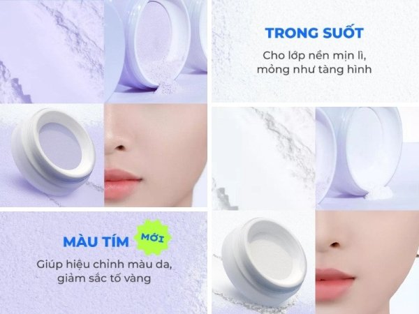 - Bao bì: Hộp tròn nhỏ gọn màu tím pastel, có lưới lọc phấn tiện lợi.