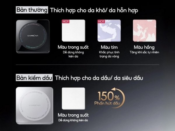 | Carslan Black Magnetic 2.0 bạc | Semi-matte, có flashback mạnh. | Rất tốt, kiềm dầu khoảng 5 – 6 tiếng. | Nhẹ, không che được lỗ chân lông. |