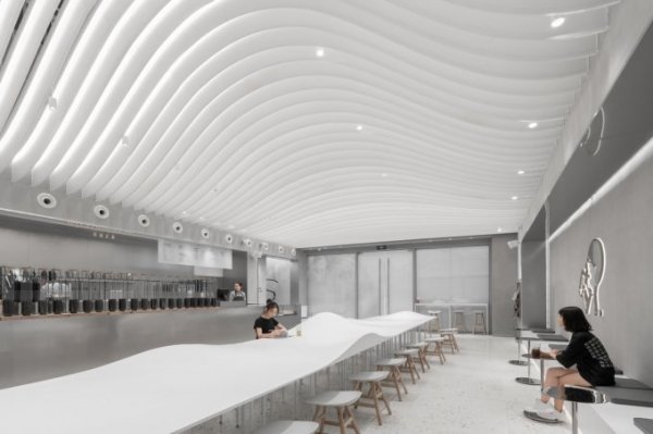 Hey Tea khẳng định phong cách độc lạ của mình bằng việc đầu tư vào phpng cách thiết kế. Chuỗi cửa hàng trà sữa Heytea tại Quảng Đông, Trung Quốc được hình thành trên mô hình cộng đồng, không hề tồn tại khái niệm riêng tư nào trong không gian mà tất cả đều được dựng xây thành khối thống nhất với con người làm trọng tâm.