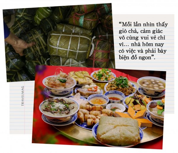 Bà bác ở cạnh nhà tôi vẫn thường hoài niệm về thời khi mới lấy chồng ở Hàng Đường và được phép chuẩn bị bữa cơm. Bà bảo, mỗi lần nhìn thấy giò chả, cảm giác vô cùng vui vẻ chỉ vì… nhà hôm nay có việc và phải bày biện đồ ngon. Các món ăn trong bữa cơm gồm gồm chả quế, giò lụa, chả cốm, chả xương sông, thêm canh măng bóng bì, gà luộc. Cảm giác ngày Tết ùa về.